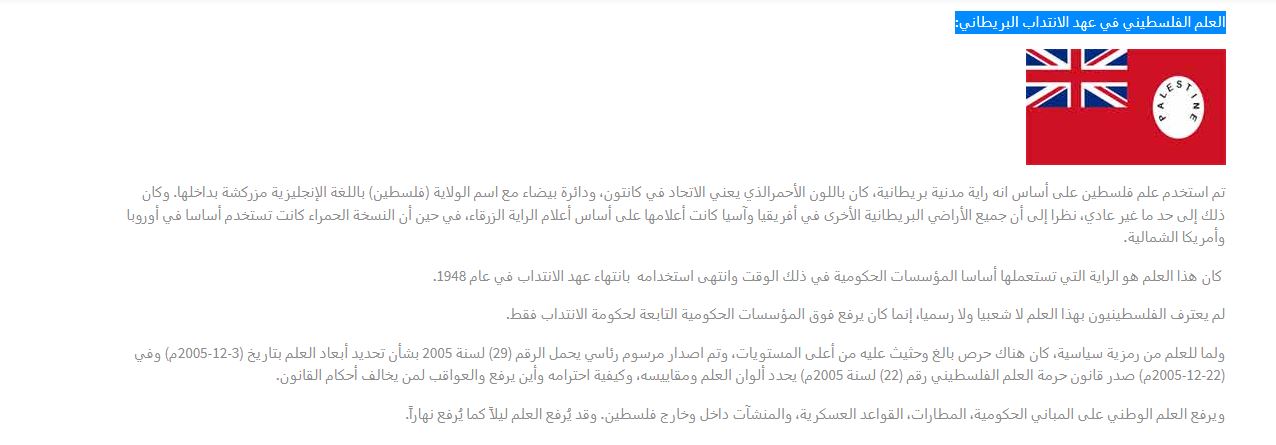 في الواقع، نشرت سفارة فلسطين في مملكة البحرين، في موقعها، صورة "للعلم الفلسطيني في عهد الانتداب البريطاني" (هنا، وايضا هنا، هنا). وأوضحت انه "تم استخدام علم فلسطين على أساس انه راية مدنية بريطانية، وكان باللون الأحمر الذي يعني الاتحاد في كانتون، ودائرة بيضاء مع اسم الولاية (فلسطين) باللغة الإنكليزية مزركشة بداخلها. وكان ذلك إلى حد ما غير عادي، نظرا إلى أن جميع الأراضي البريطانية الأخرى في أفريقيا وآسيا كانت أعلامها على أساس أعلام الراية الزرقاء، في حين أن النسخة الحمراء كانت تستخدم أساسا في أوروبا وأميركا الشمالية".