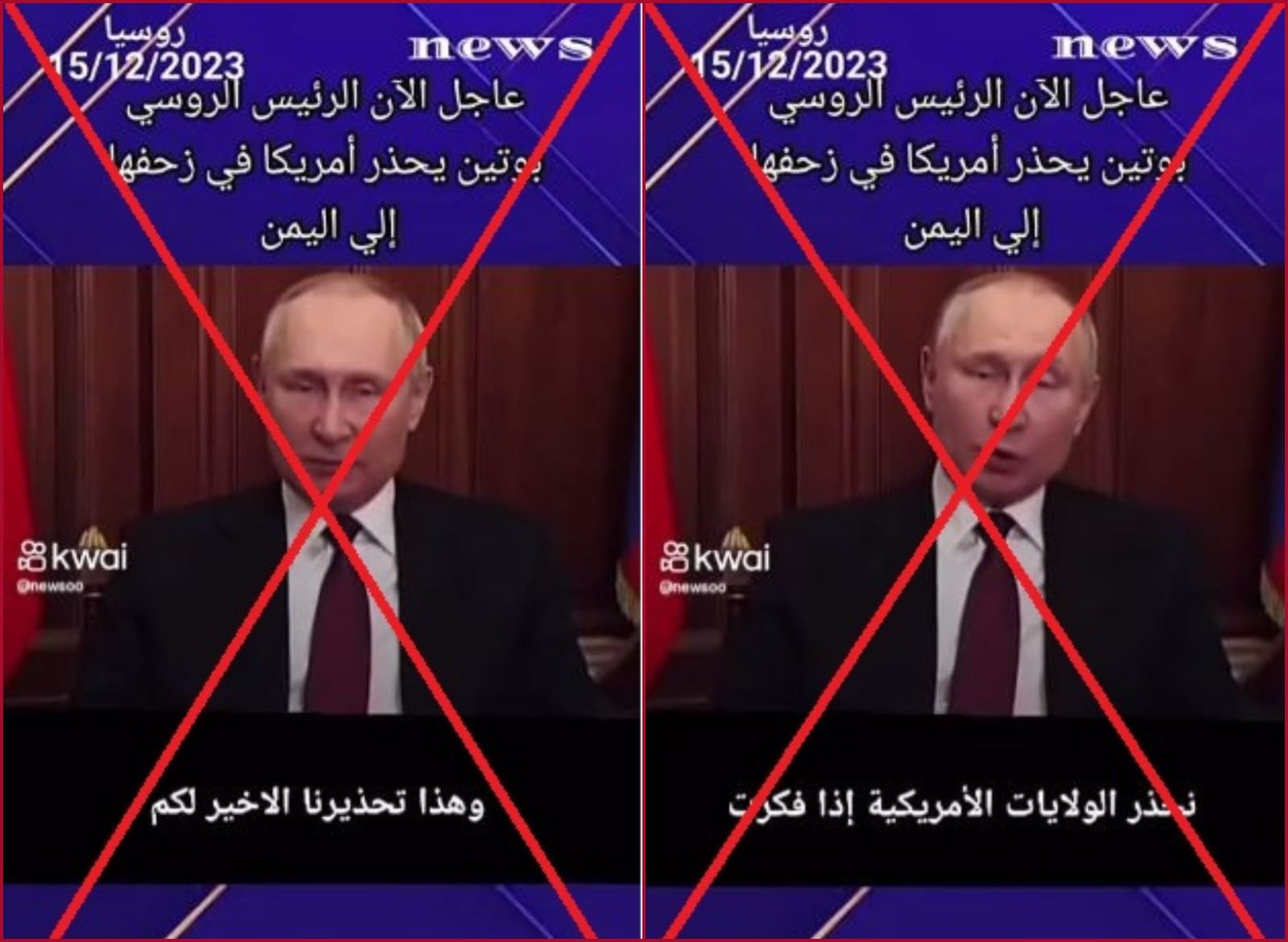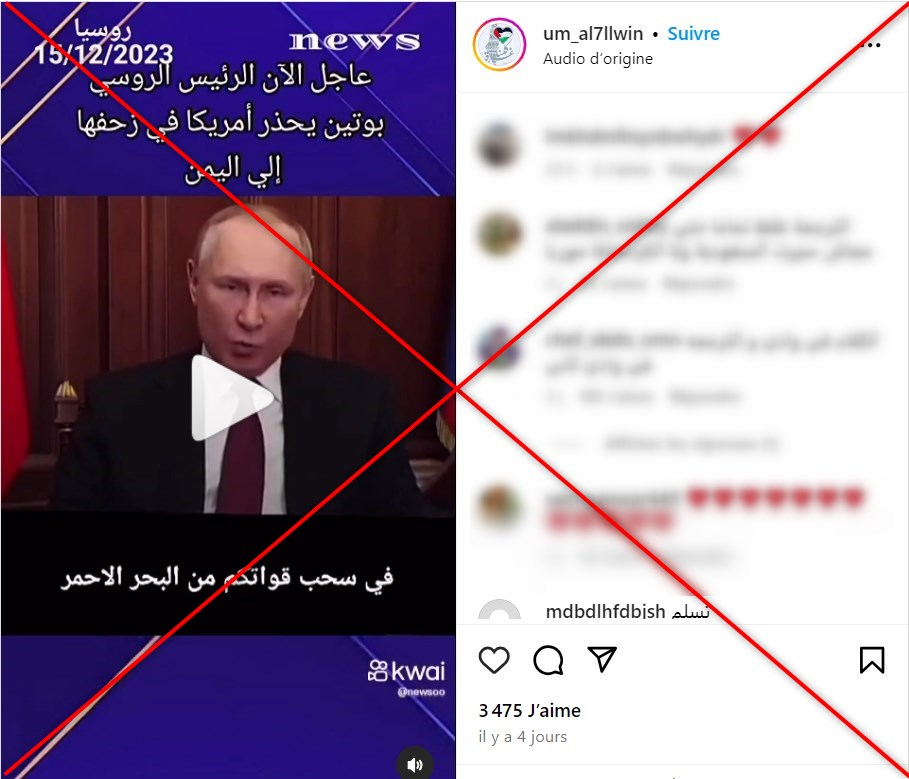 قال الحوثيون إنهم "لن يوقفوا" عملياتهم العسكرية "دعمًا لغزة" في البحر الأحمر على الرغم من إدانة الأميركيين لها واعتبارها تهديدًا "غير مقبول" لحرية التجارة في هذا الممرّ الملاحي الدولي. في هذا السياق انتشر فيديو للرئيس الروسي فلاديمير بوتين قيل إنه يحذّر فيه الولايات المتحدة ويطلب منها سحب قواتها من البحر الأحمر. إلا أن الادعاء خطأ. فالفيديو قديم، والترجمة المرفقة به غير صحيحة.
