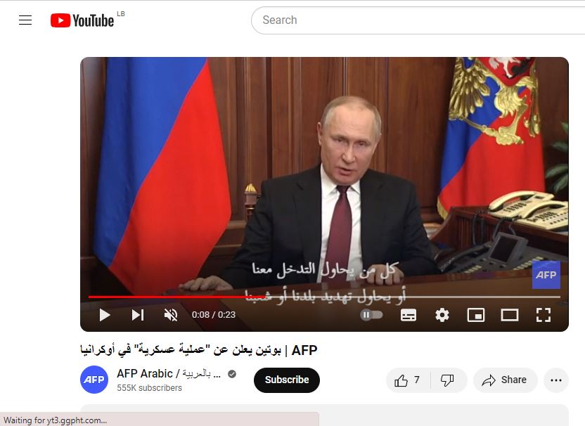 فسرعان ما تعرّف عليه صحافيو وكالة فرانس برس وهو يُظهر الرئيس الروسي معلناً عن "عملية عسكريّة" في أوكرانيا في 24 شباط من السنة الماضية.