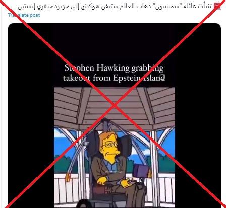 المتداول: مشاهد كرتونية من مسلسل "عائلة سيمبسون" الاميركي، وفقا للمزاعم، "تنبّأت بذهاب عالم الفيزياء البريطاني ستيفن هوكينغ الى جزيرة الملياردير ورجل الأعمال الأميركي جيفري إبستين"، الذي اتهم بجرائم جنسية.