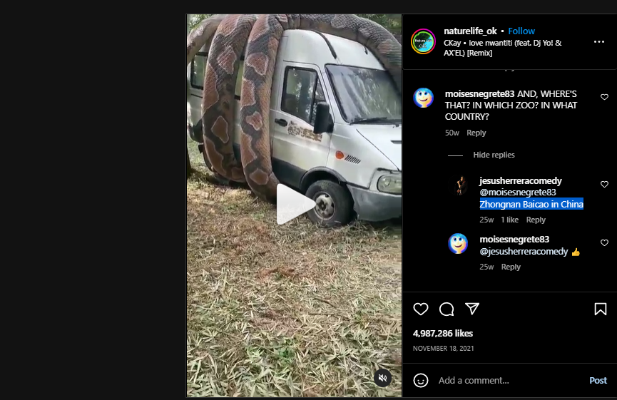 كلمات مفاتيح بالصينية تفتح الباب أمامنا، في موقع Douyin (او التيك توك في الصين)، لمشاهدة فيديوات نشرتها حديقة تشونغنان بايكاو 中南百草原 (هنا، هنا، هنا، هنا)، وتظهر الأفعى ذاتها الملتفة على الفان الابيض، الى جانب مجسمات لثعابين اخرى ضخمة في الموقع (هنا، وهنا ايضا)، وذلك كمعلم فيها للجذب السياحي والتسلية.