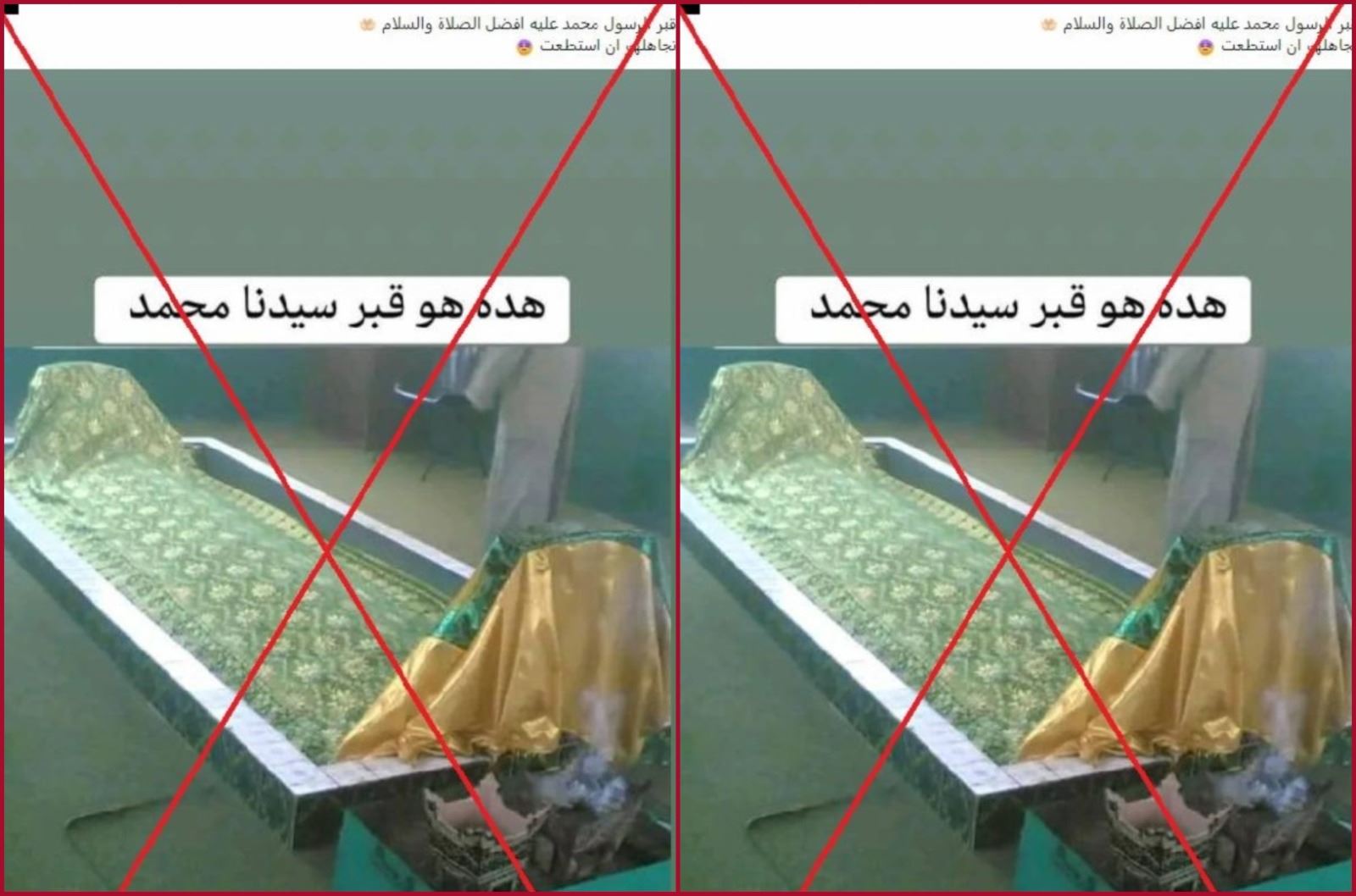 في سياق المنشورات الرامية لحصد تفاعلات على مواقع التواصل الاجتماعي، تداولت صفحات وحسابات على موقع فيسبوك صورة قيل إنّها لقبر النبيّ محمّد في المدينة المنوّرة. لكن هذا الادّعاء، وعلى غرار ادّعاءات كثيرة مشابهة سابقة، غير صحيح. والصورة ملتقطة في الحقيقة في ضريح في سلطنة عُمان يسود اعتقاد بين السكان المحلّيين أنّه للنبيّ أيّوب، المكرّم في الديانات الإبراهيميّة الثلاث.