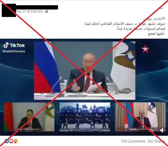 تداولت صفحات وحسابات على مواقع التواصل الاجتماعي لا سيّما في ليبيا، مقطعاً مصوّراً قيل إنه يُظهر الرئيس الروسي فلاديمير بوتين وهو "يتوقّع عودة عائلة القذافي إلى الحكم في ليبيا" بعد أكثر من عقد على الإطاحة بها. لكن هذا الادّعاء غير صحيح، والفيديو مركّب.