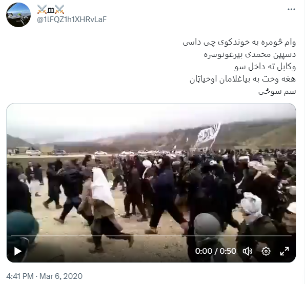 المتداول: فيديو يظهر، وفقا للمزاعم، "مواصلة حركة طالبان حشد عناصرها على الحدود الافغانية- الايرانية"، في وقت حصلت اشتباكات أخيراً بين الحركة والقوات الإيرانية عند الحدود، في سياق توترات بين البلدين حول توزيع مياه سد هلمند.