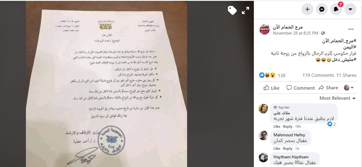 الوقائع: بعنوان: "#اليمن قرار حكومي يُلزم الرجال بالزواج من زوجة ثانية"، تكثف الكلام على الوثيقة في وسائل التواصل الاجتماعي (هنا، هنا، هنا، هنا...)، في وقت يتم التشارك فيها، لا سيما عبر الواتساب.