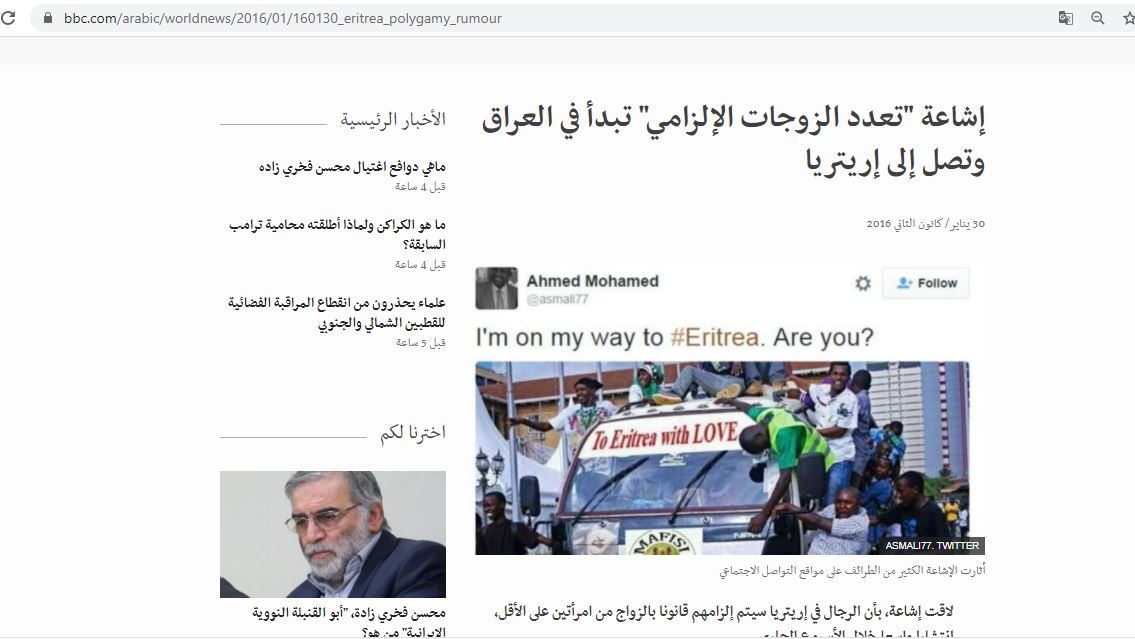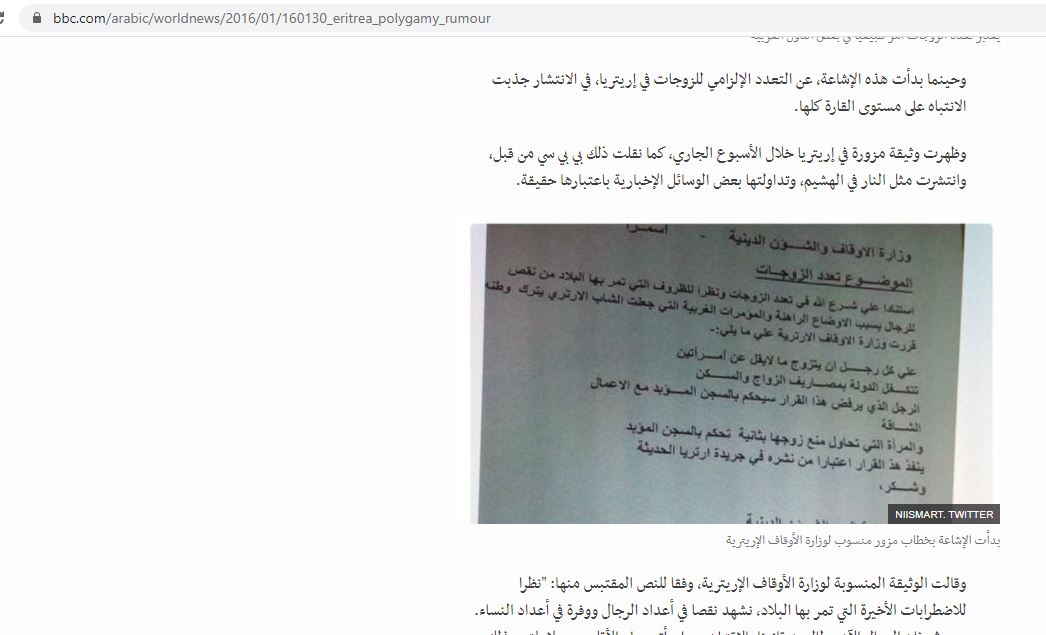 وكتب موقع "بي بي سي"، في تقرير في 30 ك2 2016، عن "شائعة التعدد الإلزامي للزوجات"، وأنها "تبدأ في العراق، وصولا إلى إريتريا" (هنا، وايضا هنا،وهنا...). وافاد ان "مروجيها استخدموا طريقة تسريب وثيقة حكومية رسمية على مواقع التواصل الاجتماعي، تحمل ترويسة خطاب أو توقيع شخص يفترض أنه مسؤول رسمي رفيع المستوى".