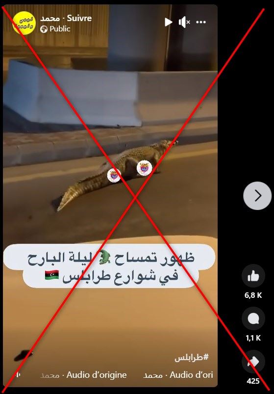 تداولت صفحات على مواقع التواصل الاجتماعي لا سيما في ليبيا مقطع فيديو قيل إنه لظهور تمساح في شوارع العاصمة طرابلس. لكن الادعاء خطأ، والفيديو مصور في مدينة القطيف شرق السعوديّة.