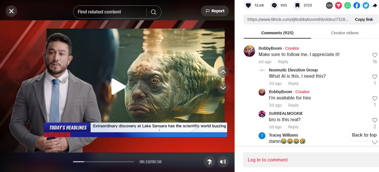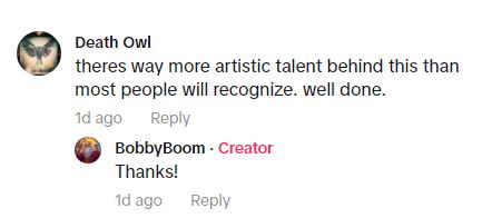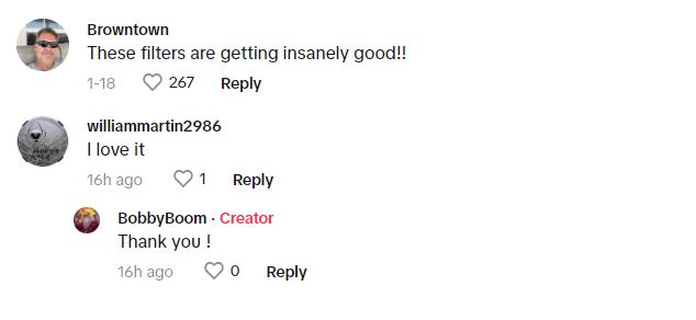 وفوق كل هذا، نجد تفاعل حساب bobbyboom88@ مع ردود متابعيه على الفيديو مثيرا للاهتمام، لما يحمل في طياته من اعتراف ضمني بأن هذه المشاهد تلاعب رقمي. فهو يرد بوجه ضاحك عندما يشكره أحدهم "على الرسومات النابضة بالحياة الـAI". ويشكر آخر أشاد بعمله وبـ"موهبته الفنية" (هنا، هنا).