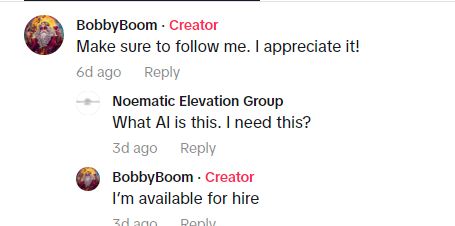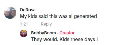 وعندما كتب له أحدهم ان "أطفالي يقولون إن هذه المشاهد تم إنشاؤها بالذكاء الاصطناعي" (هنا) أجاب bobbyboom88: "قد يكون كذلك". وعندما سأله آخر: هل هذا ذكاء اصطناعي؟ أحتاج الى هذا"، اجابه: "أنا متاح للتوظيف".
