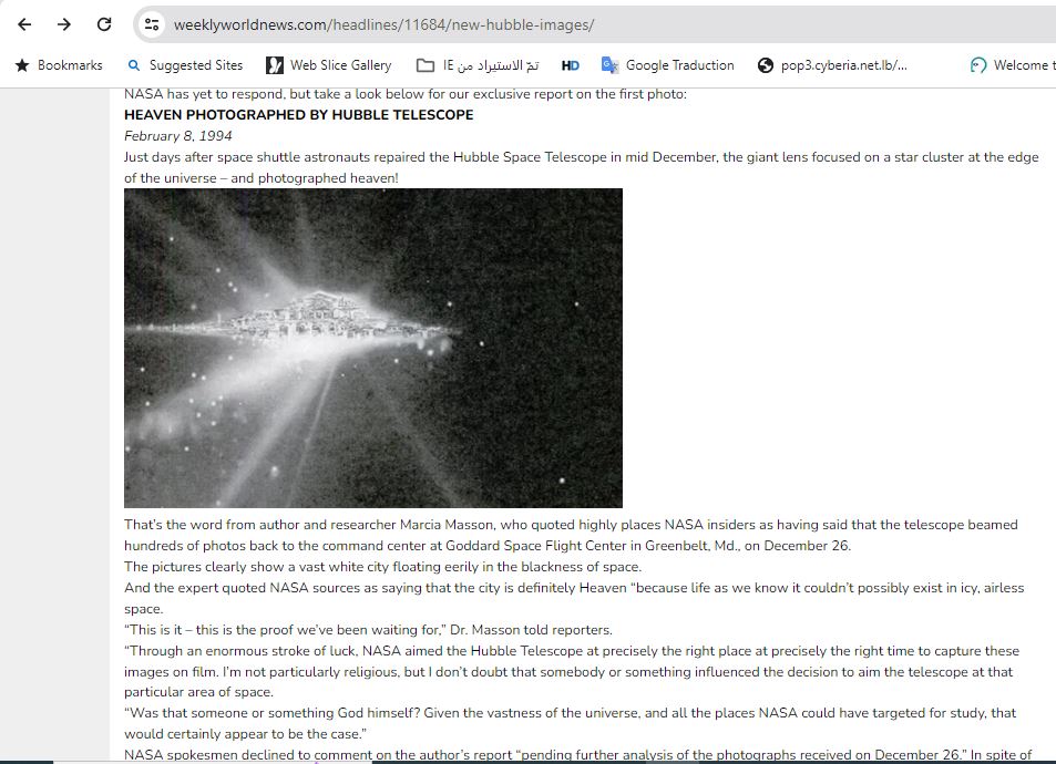 وبعنوان فرعي: "تم تصوير الجنة بواسطة تلسكوب هابل- 8 شباط 1994"، ادعى الموقع انه "بعد أيام فقط من إصلاح رواد مكوك الفضاء تلسكوب هابل الفضائي في منتصف شهر كانون الاول، ركزت العدسة العملاقة على مجموعة نجوم على حافة الكون - وصورت الجنة. وهذه كانت كلمات المؤلفة والباحثة مارسيا ماسون، التي نقلت عن مصادر مطلعة في ناسا إن التلسكوب أرسل مئات الصور إلى مركز القيادة في مركز غودارد لرحلات الفضاء في غرينبيلت بولاية ماريلاند في 26 كانون الاول. وتظهر الصور بوضوح مدينة بيضاء شاسعة تطفو بشكل مخيف في سواد الفضاء".