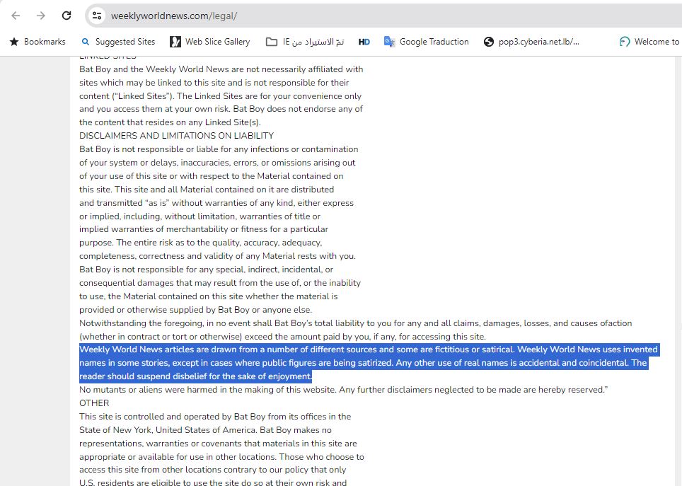 ايا يكن، تبقى هذه القصة برمتها غير جدية اطلاقا، مشكوك في صحتها، نظرا الى نوعية الاخبار التي ينشرها موقع ويكلي وورلد نيوز. فهو يقرّ، في شروط الاستخدام واخلاء المسؤولية (هنا)، بأنه "يستوحي مقالات من مصادر مختلفة، بعضها وهمي أو ساخر. ويستخدم أسماء مخترعة في بعض القصص، باستثناء الحالات التي يتم فيها السخرية من شخصيات عامة. وأي استخدام آخر للأسماء الحقيقية هو عرضي ومحض الصدفة. وينبغي للقارئ أن يترك عدم اليقين من أجل الاستمتاع"، معلنا أن "الاخطار المتعلقة بجودة أي مادة ودقتها وكفايتها واكتمالها وصحتها وصلاحيتها تقع على عاتقكم".