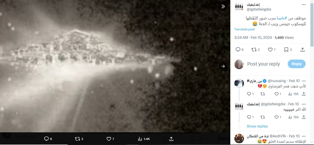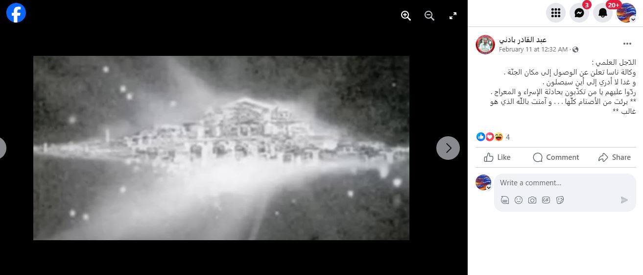ضجة في وسائل التواصل الجتماعي بسبب صورة تظهر جسما مشعا على خلفية سوداء. وقد تكثف التشارك فيها أخيرا، عبر حسابات، عربية وأجنبية، ارفقتها بالمزاعم الآتية (من دون تدخل او تصحيح): "وكالة ناسا تدعي انها وجدت مكان الجنة وصورتها بواسطة التلسكوب"، وايضا "موظف من ناسا سرب صور التقطها تليسكوب جيمس ويب للجنة".
