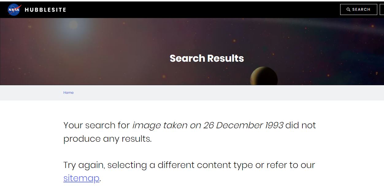 كذلك، لا نجد في ارشيف صور تلسكوب "هابل" صورا التقطها في 26 كانون الاول 1993 (هنا) (التاريخ الذي زعمته المقالة الخيالية).
