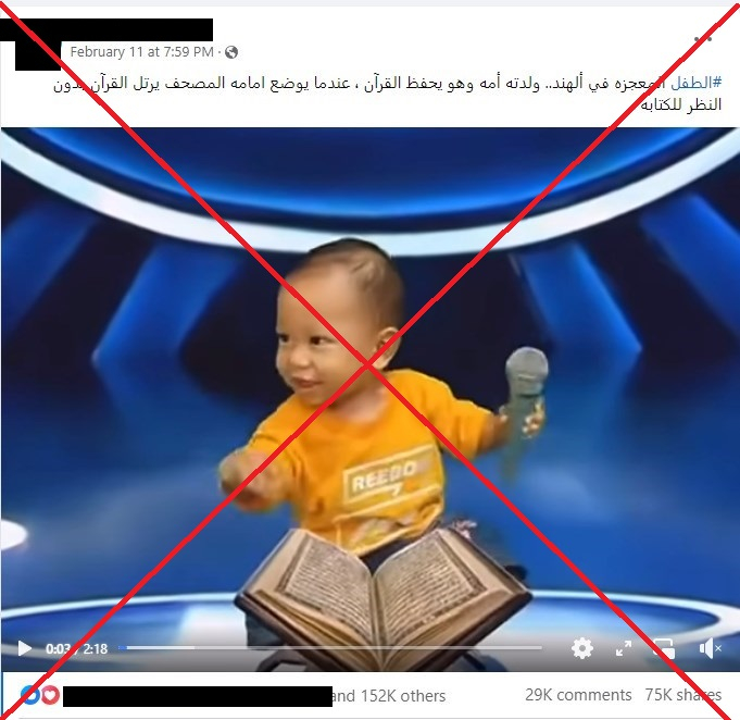 ضمن المنشورات الرامية لجمع تفاعلات على صفحات وحسابات على مواقع التواصل، تداول مستخدمون في الآونة الأخيرة مقطعاً مصوّراً قيل إنّه يُظهر طفلاً هندياً في السنوات الأولى من عمره وهو يتلو القرآن بإتقان وسط تأثر من يبدو أنّهم أعضاء لجنة تحكيم. لكن هذا الفيديو مُركّب على غرار عشرات من المقاطع المماثلة المنتشرة في السنوات الماضية.