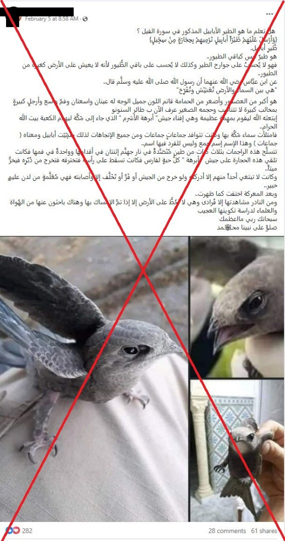 تداولت صفحات وحسابات على مواقع التواصل الاجتماعي باللغة العربيّة صوراً زعم ناشروها أنّها تُظهر "الطير الأبابيل" التي ورد ذكرها في القرآن، كعقاب إلهي لجيش حبشيّ أراد هدم الكعبة قبيل ظهور الإسلام. وقالت المنشورات إنّ هذه الطيور لها خاصيات تجعلها خارج تصنيفات الطيور الأخرى الموجودة في العالم. لكن هذا الادّعاء ينطوي على أخطاء علميّة ومغالطات دينيّة في آن واحد.