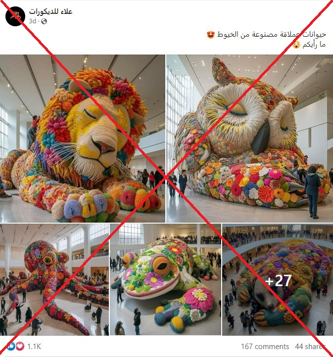 مئات المشاركات والتعليقات حصدتها مجموعة من الصور على مواقع التواصل الاجتماعي ادعى ناشروها أنها لدمى حيوانات عملاقة مصنوعة من الخيوط. إلا أن الادعاء غير صحيح، فالصور في الحقيقة مولّدة عبر برنامج ذكاء اصطناعي.