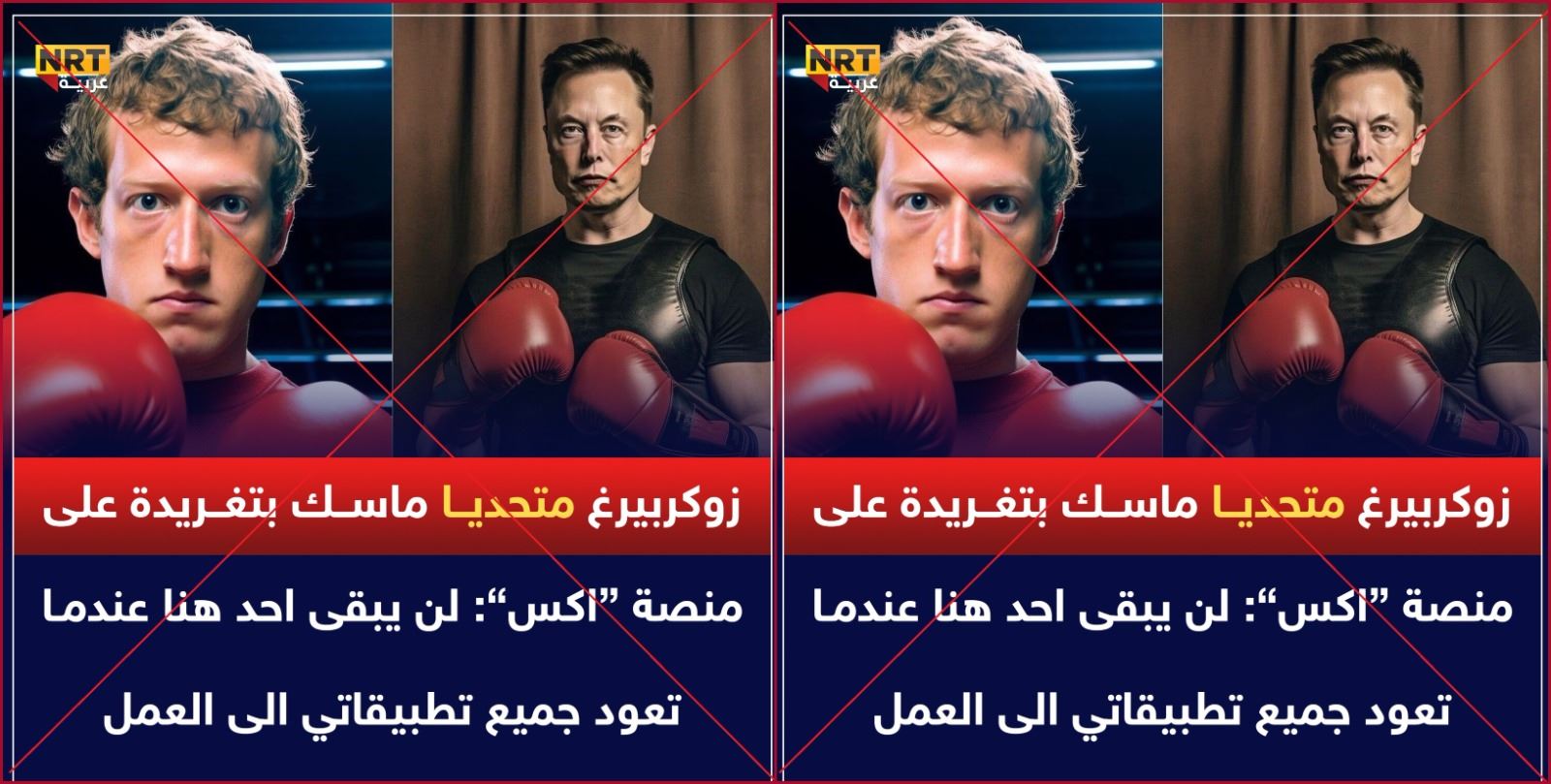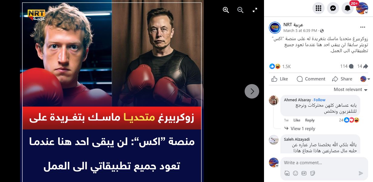 المتداول: منشور منسوب الى الرئيس التنفيذي لشركة "ميتا" مارك زوكربيرغ "تحدى فيه"، وفقاً للمزاعم، رجل الاعمال ايلون ماسك "بالقول له لن يبقى احد هنا عندما تعود جميع تطبيقاتي الى العمل".