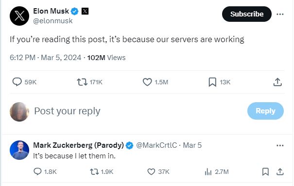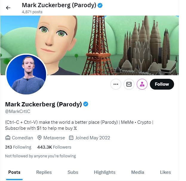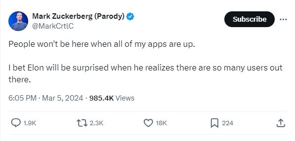 كلمات مفاتيح بالانكليزية تقودنا فورا الى حساب ساخر في اكس Parody يحمل اسم مارك زوكربيرغ (هنا) نشره في 5 آذار 2024.