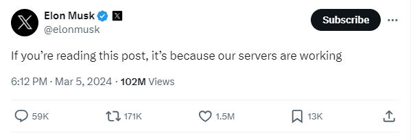 تزامن انتشار المنشور مع تعطل تطبيقات فايسبوك وإنستغرام وماسنجر عن العمل بشكل مفاجئ، الثلثاء 5 آذار 2024، حيث واجه مستخدمون صعوبة في الوصول اليها، وفقا لما ذكرت تقارير اعلامية (هنا، هنا، هنا، هنا...).