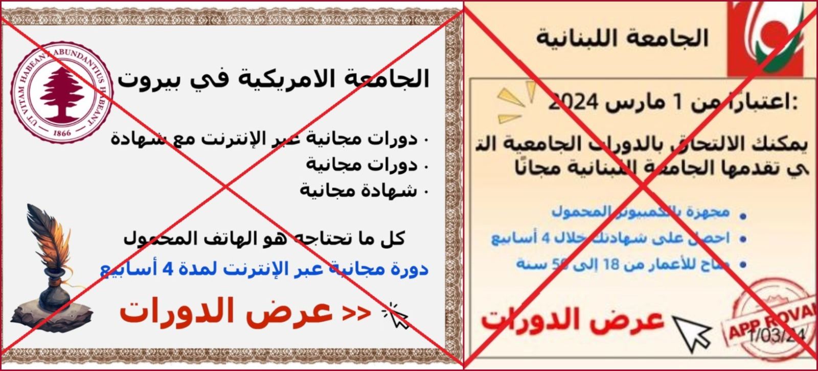 تنشر إحدى الصفحات في الفايسبوك اعلانات عن "تنظيم الجامعة الاميركية في بيروت والجامعة اللبنانية دورات تعليمية مجانية عبر الانترنت مع نيل المشاركين فيها شهادات مجانية"، الامر الذي رحّب به مستخدمون كثر. الا ان هذه الاعلانات "زائفة، لا صحة لها"، بتأكيد من الجامعتين المعنيتين لـ"النهار"، منبهتين الى وجوب عدم تصديقها والحذر منها. FactCheck#