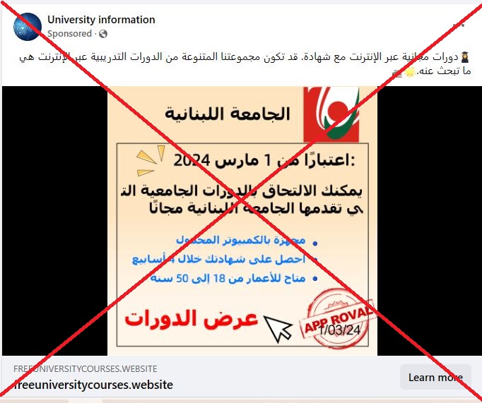 تحمل الصفحة في الفايسبوك اسم University information، وترفق اعلاناتها برابط يقود الى موقع freeuniversitycourses.website، يفتح امام الزوار "خيارات" للحصول على "دورات عن بعد"، وفقا للمزاعم. الا انه يجب الحذر من هذه الصفحة، لأن اعلاناتها عن "دورات تعليمية مجانية عبر الانترنت" تقيمها كل من الجامعة الأميركية في بيروت والجامعة اللبنانية كاذبة، مختلقة.