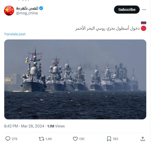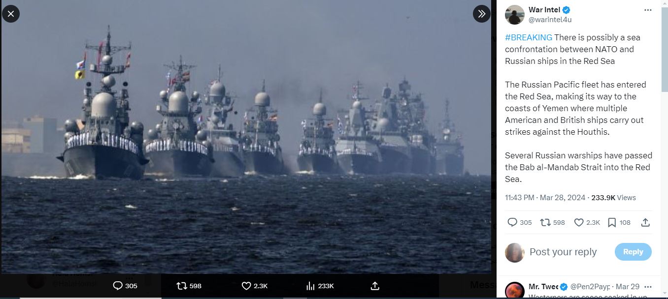 الصورة تظهر سفنا مبحرة معا. وقد تكثف التشارك فيها أخيرا عبر حسابات، عربية وأجنبية، ارفقتها بالمزاعم الآتية (من دون تدخل): "دخول أسطول بحري روسي البحر الأحمر".