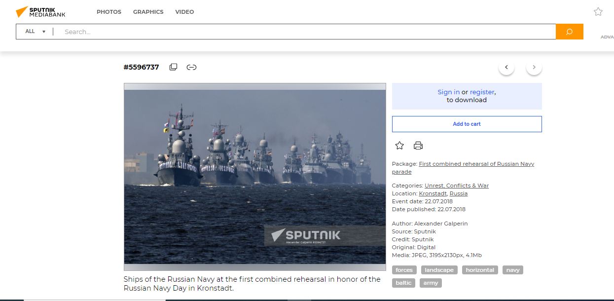 فالبحث العكسي عنها يوصلنا الى وكالة "سبوتنيك" التي نشرتها في 22 تموز 2018 (هنا)، مع الشرح الآتي: "سفن البحرية الروسية في أول تدريب مشترك في كرونشتادت Kronstadt، في مناسبة يوم البحرية الروسية (هنا ايضا وكالة ريا).