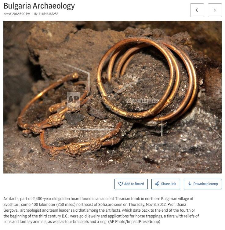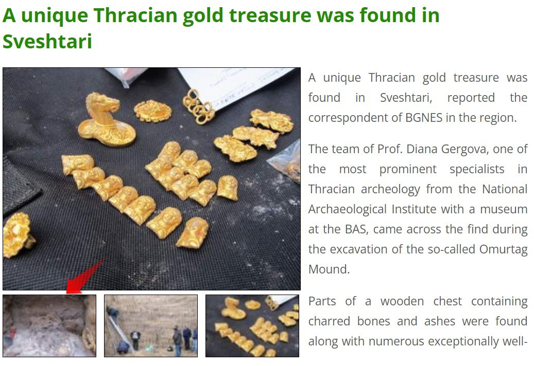 أما الصورتان الثالثة والرابعة، فتظهران قطعاً أثرية، تشكل جزءاً جزء من كنز ذهبي عمره 2400 وُجد في مقبرة قديمة في قرية شمال بلغاريا، إحداهما نشرتها وكالة "أسوشيتد برس" سنة 2012، والأخرى منشورة على مواقع بلغاريّة محليّة في السنة ذاتها.
