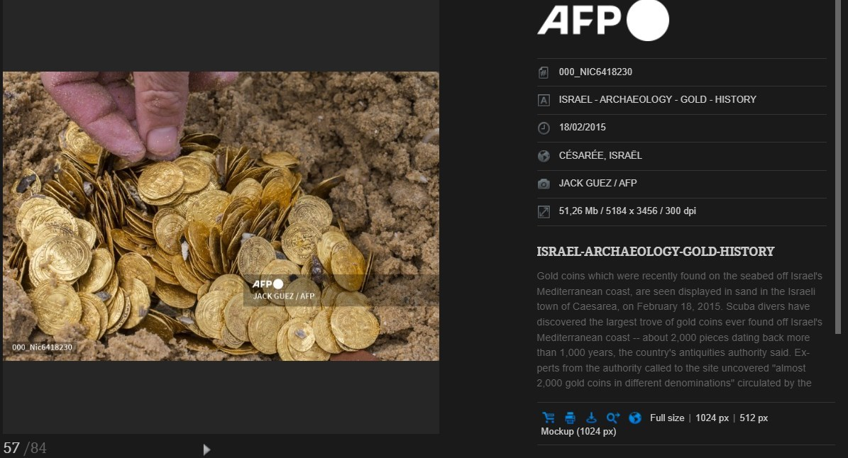 والصورة الثانية وزعتها وكالة "فرانس برس" عام 2015 وهي لعملات قديمة عثر عليها في قاع البحر قبالة ساحل البحر الأبيض المتوسط في إسرائيل.