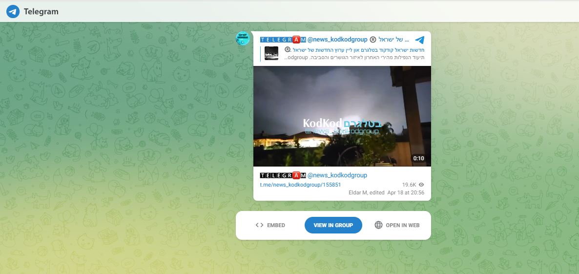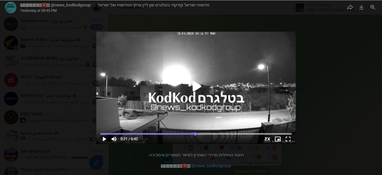 ووفقاً لما عثرنا عليه، نشرت هذه القناة في تلغرام الفيديو الساعة 20:56 مساء امس الخميس، اي قبل ساعات عدة من الانباء عن انفجارات في ايران فجر الجمعة. وارفقته بتعليق: "توثيق الأضرار من جراء القصف الأخير في منطقة غوشريم ومحيطها" (الجليل الأعلى).