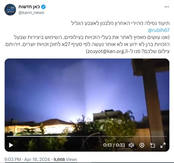 بدوره، نشر حساب kann_news@ الاسرائيلي في اكس الفيديو (هنا) الساعة 21:03 مساء الخميس، مرفقاً بتعليق: "توثيق قصف من لبنان على اصبع الجليل".