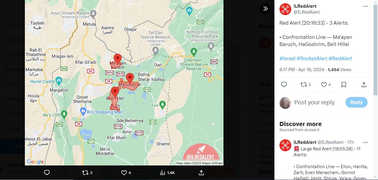 بالفعل، وزّع حساب ILRedAlert@ في أكس (هنا)، الساعة 20:17 مساء الخميس، "انذارا أحمر" بشأن مستوطنات معيان باروخ، هغوشريم، وبيت هليل.