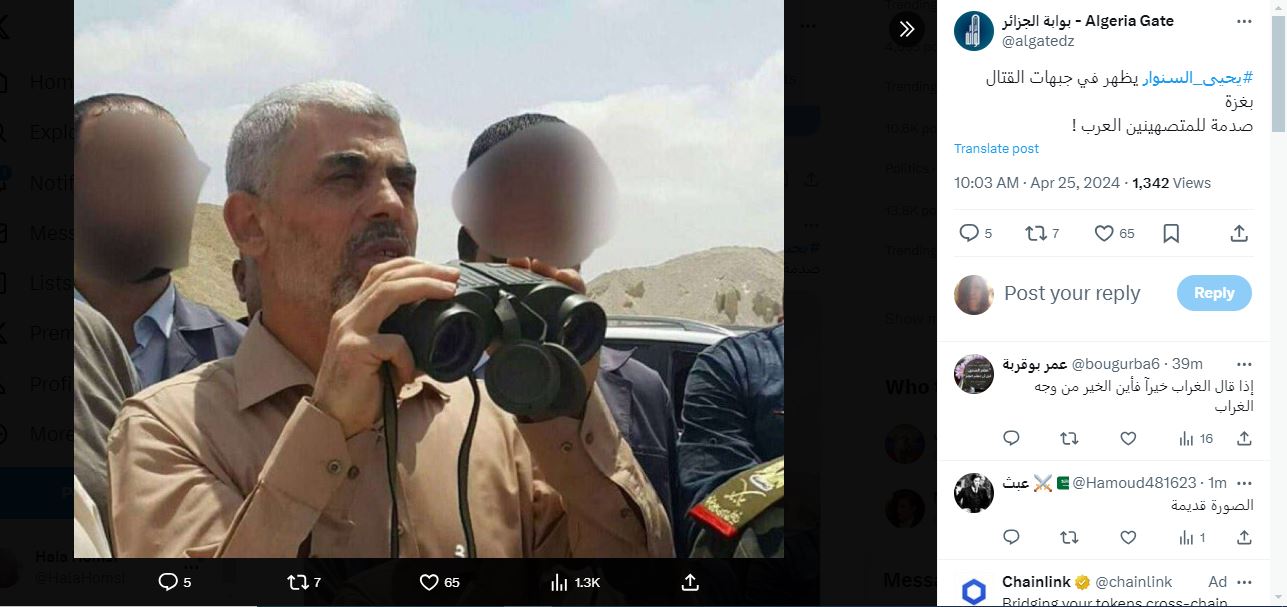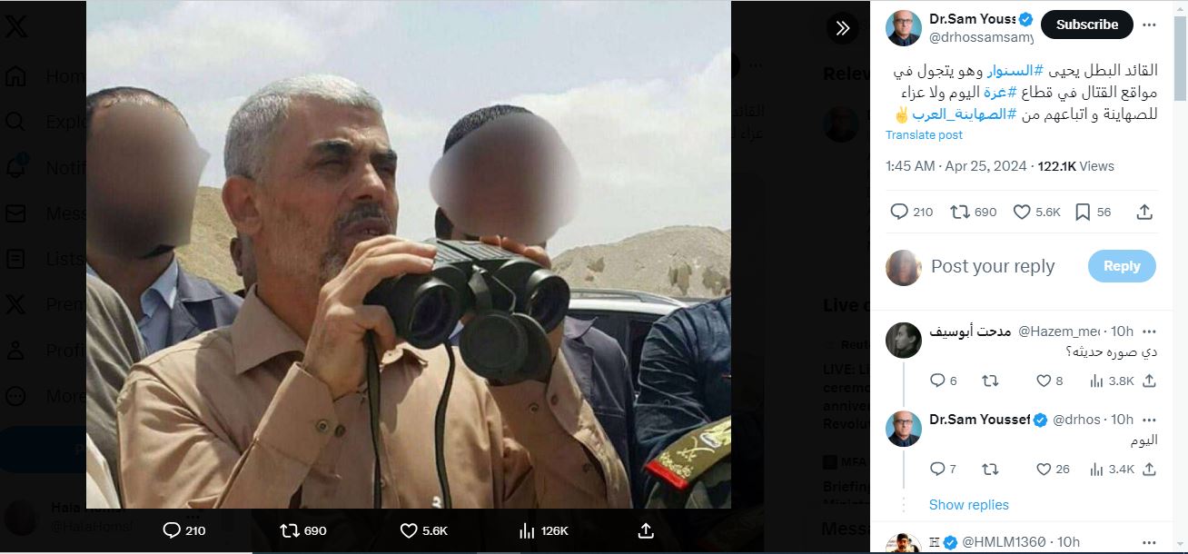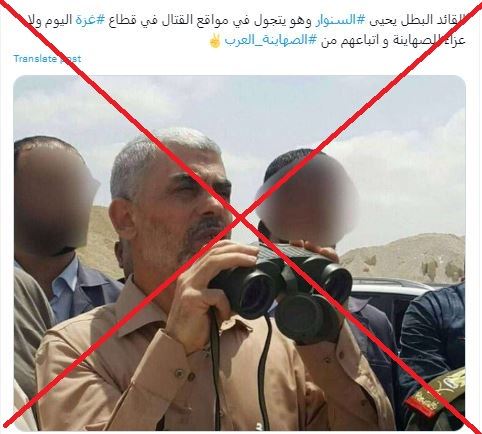 الصورة تظهر زعيم حركة حماس في قطاع غزّة يحيى السنوار حاملا منظارا بين يديه، بينما وقف معه اشخاص. وقد تكثف التشارك في الصورة خلال الساعات الماضية عبر حسابات ارفقتها بالمزاعم الآتية (من دون تدخل): "يحيى السنوار يتجول في مواقع القتال في قطاع غزة اليوم"، وايضا "يحيى السنوار يظهر في جبهات القتال بغزة".