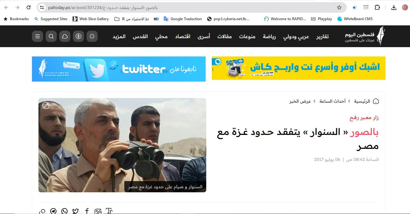 فالبحث العكسي عنها يوصلنا الى موقع "فلسطين اليوم" الذي نشرها مع صور أخرى في 6 تموز 2017، ضمن تقرير عن تفقد السنوار حدود غزة مـع مصر (هنا).