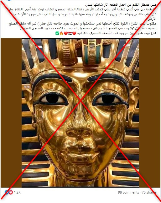 في سياق المنشورات المتداولة التي تشيد برقيّ وتقدّم الحضارة المصريّة القديمة على مواقع التواصل الاجتماعي، تنشر بين الحين والآخر صفحات، ولا سيّما المصريّة منها، قصصاً خياليّة عن هذه الحضارة لا تمتّ لها بصلة. وآخر هذه المنشورات زعمت أن قناع الملك المصري القديم توت عنخ آمون نُقشت عليه بالهيروغليفية جملة تقول إن "القوة تفتح أجنحتها لمن يستحقها والموت يفرد جناحيه لكل جبان". الا ان هذا الادعاء لا صحّة له، والمعلومات الموثّقة عن هذا القناع فصّلها لوكالة فرانس برس خبيران في علم المصريات.