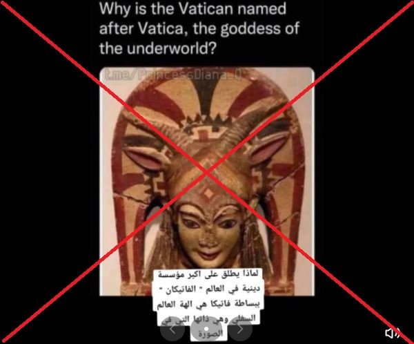 الحقيقة: الصورة تظهر قطعة أثرية لرأس جونو، الإلهة الرومانية القديمة الحامية، والتي تعود الى نحو 500- 480 ق.م. وهي معروضة في أحد المتاحف في برلين بألمانيا. وبالنسبة الى الإلهة فاتيكا، لم يمكن خبراء سألتهم "النهار" العثور على اسمها بين آلهة الحضارة الإترورية، بما يعزّز فرضية انه مختلق. أما اسم الفاتيكان، فله شرح مغاير. FactCheck#