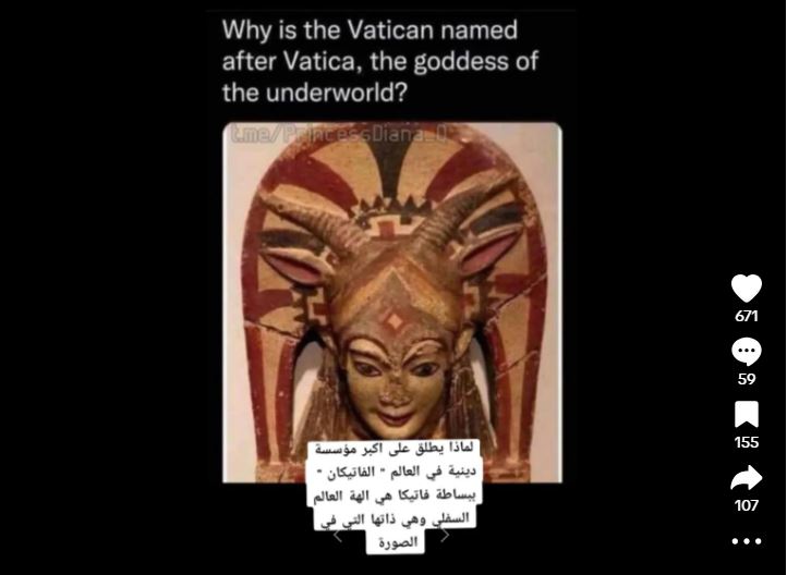 يلحّ السؤال منذ أن أصبح موضع اهتمام مستخدمين يتناقلونه عبر حساباتهم: "لماذا يُطلَق على أكبر مؤسسة دينية في العالم، الفاتيكان، (اسم) فاتيكا، التي هي إلهة العالم السفلي، وهي ذاتها التي في الصورة".