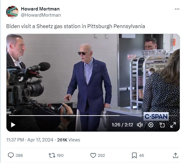 نتعمق في البحث، باستخدام كلمات مفاتيح بالانكليزية، فنصل الى حساب مدير الاتصالات في C-SPAN هوارد مورتمان في أكس، الذي نشره في 17 نيسان 2024 (هنا)، مع تعليق: "بايدن يزور محطة وقود شيتز في بيتسبرغ في بنسلفانيا" (هنا ايضا).