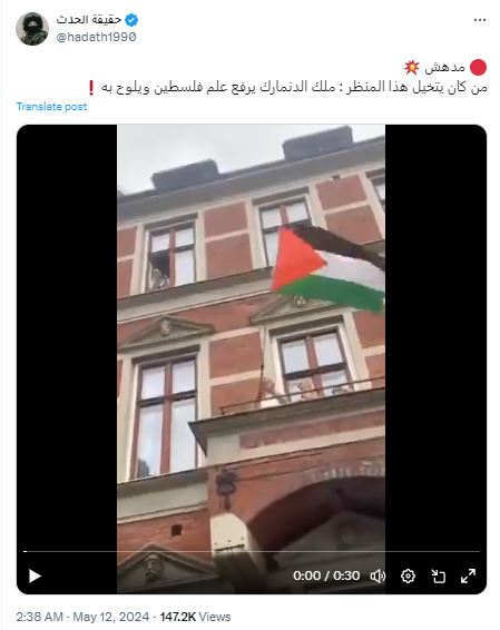 المتداول: فيديو يظهر، وفقا للمزاعم، "ملك الدانمارك حاملا علم فلسطين، وملوحا به"، تضامناً مع الشعب الفلسطيني في وقت تتواصل الحرب بين اسرائيل وحركة حماس في قطاع غزة.