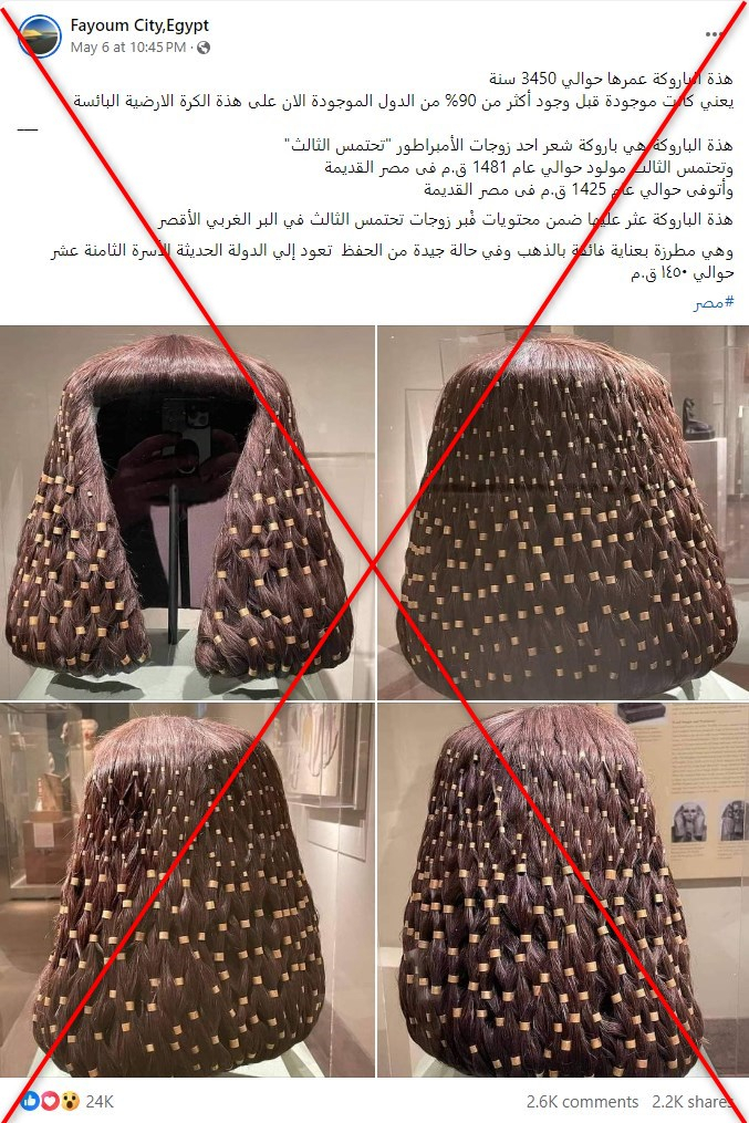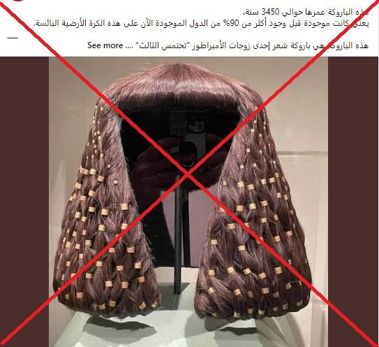 تكتسب حضارة مصر القديمة أهميّة بالغة بين الحضارات نظراً لغناها وتقدّمها في مجالات عدّة. وكثيرة هي المعلومات والاكتشافات الأثريّة المثيرة الموثّقة عمّا قدّمته هذه الحضارة، إلا أنّ رواداً لمواقع التواصل الاجتماعي لا يوفّرون فرصة لضخّ معلومات غير صحيحة عنها ما يساهم في التضليل وصرف الانتباه عمّا هو صحيح. آخر المنشورات تدّعي العثور على شعر مستعار مطرز بالذهب بحالة جيّدة يعود لإحدى زوجات "تحتمس الثالث" عمره أكثر من ثلاثة آلاف سنة. إلا أنّ كل ما أوردته المنشورات لا صحّة له بحسب الخبراء الذين شرحوا أن الشعر المستعار في الصورة ليس حقيقياً بل هو نسخة طبق الأصل عن شعر متحلّل يعود على الأرجح إلى أميرة مصريّة قديمة أخرى اسمها سات حتحور.
