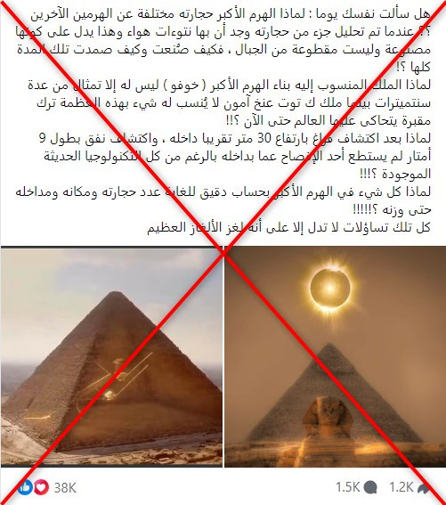 يستغلّ مستخدمون لمواقع التواصل الاجتماعي الاهتمام الكبير بالحضارة المصريّة القديمة والغموض الذي يلفّها في كثير من الأحيان لبثّ معلومات مضلّلة بهدف جذب التفاعلات. آخر تلك المنشورات المضلّلة تدّعي أنّ الأحجار التي استخدمت في بناء الهرم الأكبر (هرم خوفو)، "فيها نتوءات هواء" ما يعني أنّها من صنع البشر وليست طبيعيّة. لكن هذا الادعاء لا أساس له من الناحية العلمية، بحسب خبراء في علم المصريات.