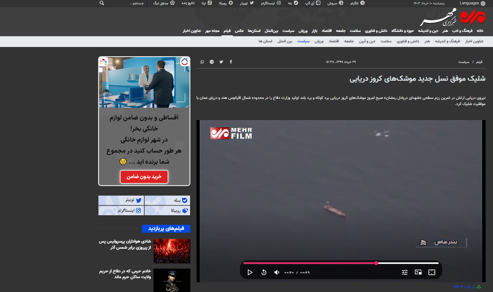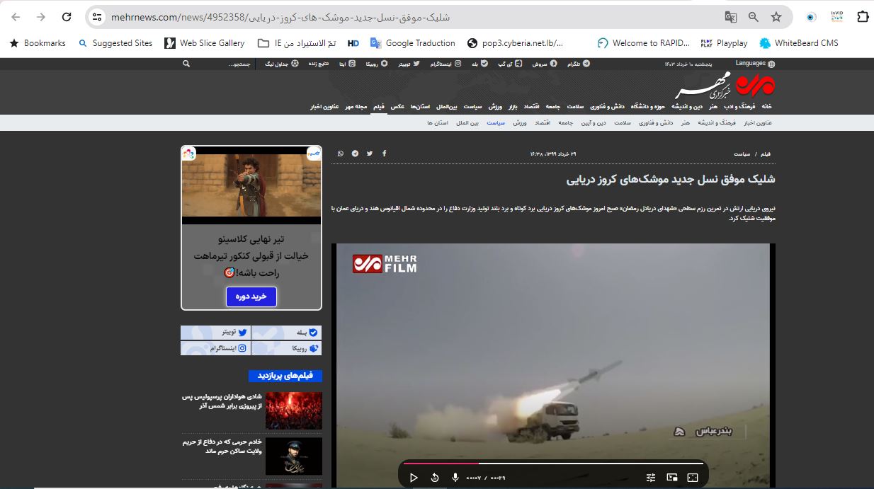 وقال الموقع الإلكتروني للجيش الإيراني، الخميس 18 حزيران 2020، إن القوات البحرية التابعة للجيش الإيرني نفذت هذه المناورة في بحر عُمان وشمال المحيط الهندي. واشار الى أنه تم استعمال صواريخ من نوع كروز بعيدة المدى وقصيرة المدى خلال هذه المناورة من نوع أرض بحر، وبحر بحر، مؤكدا أن الصواريخ أصابت أهدافها على بعد 280 كيلومترا شمالي المحيط الهندي.