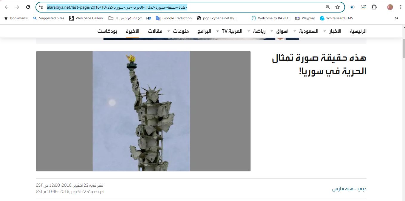 المتداول: صورة تظهر، وفقاً للمزاعم، "تمثالا للحرية صنعه فنان سوري من بقايا بيوت مدمرة".