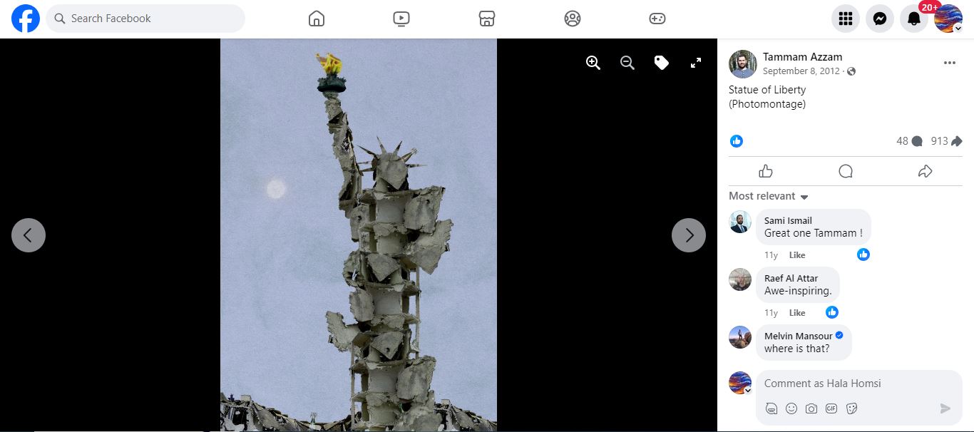 فالبحث العكسي يوصلنا الى خيوط (هنا) تقودنا الى صفحة الفنان السوري تمام عزام Tammam Azzam في الفايسبوك، حيث وجدناها منشورة في 8 ايلول 2012 (هنا) بعنوان: تمثال الحرية (فوتومونتاج).