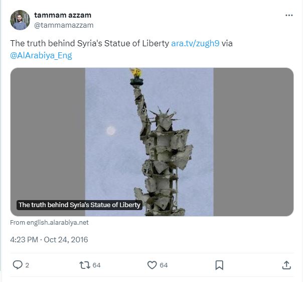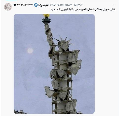 الصورة تظهر تمثالاً شبيها بتمثال الحرية في نيويورك، الا انه تم تكوينه من بيوت مدمرة وركام. وقد تكثف التشارك فيها أخيرا عبر حسابات ارفقته بالمزاعم الآتية (من دون تدخل): "فنان سوري يحاكي تمثال الحرية من بقايا البيوت المدمرة".