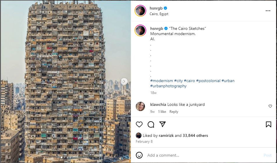 فالبحث العكسي يوصلنا الى مصدر الصورة، المصمم المصري- الاميركي حسن رجب Hassan Ragab، الذي نشرها مع صور أخرى في حسابيه في اكس وانستغرام (هنا، هنا)، في 8 شباط 2024، بعنوان: The Cairo Sketches Monumental modernism (اي اسكتشات القاهرة- الحداثة الضخمة).