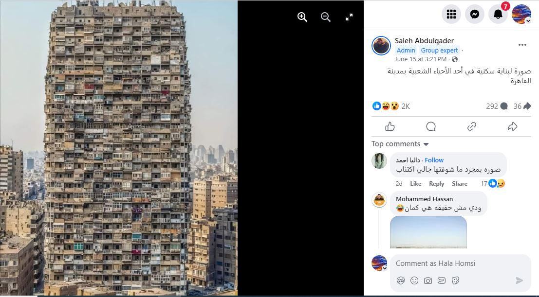 النتيجة: اذاً، لا صحة للمزاعم ان الصورة المتناقلة تظهر "بناية سكنية في أحد الأحياء الشعبية في القاهرة" بمصر. في الواقع، هذه الصورة ليست حقيقية، لكونها منشأة بواسطة برنامج ذكاء اصطناعي. وقد انشأها المصمم المصري- الاميركي حسن رجب ونشرها بهذا الوصف في حساباته في 8 شباط 2024.