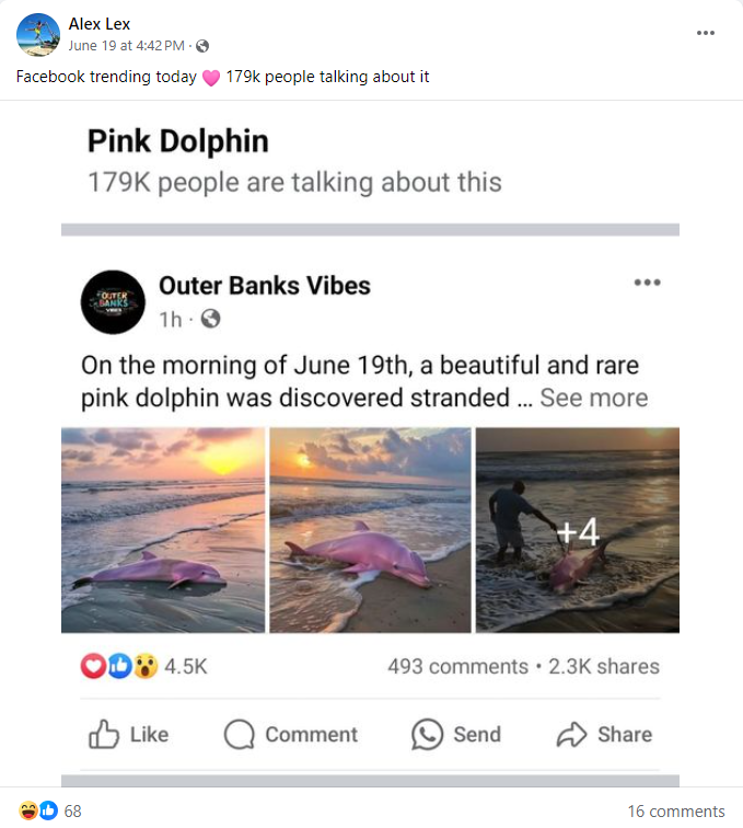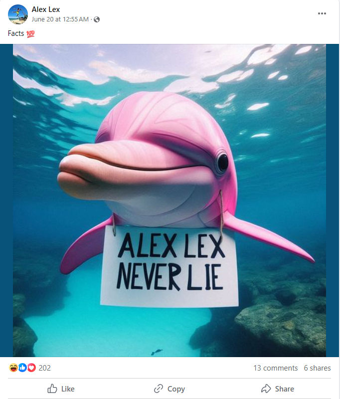 ويبدو أن Alex Lex@ هو من أنشأ الصور، وفقا لما توصل اليه زملاؤنا في Snopes. فقد قال في منشور في صفحته في الفايسبوك: "أعتذر عن إغراقكم بمنشورات حول الدلفين الوردي" (هنا)، ليضيف الصور المتناقلة الى منشور مع تعليق: "انها الأكثر تداولا على الفايسبوك اليوم، 179 ألف شخص يتحدثون عنها" (هنا). وفي منشور آخر، نشر صورة زائفة لدلفين وردي مبتسماً، حاملاً لافتة كتب عليها: "اليكس لكس لا يكذب ابدا" (هنا).