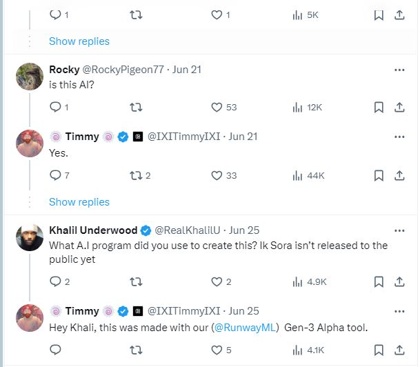 وينشر IXITimmyIXI@ الذي يعرّف بنفسه انه مدير مجتمع RunwayML وخبير في الفن التوليدي واستشاري في الذكاء الاصطناعي، فيديوات اخرى كثيرة منشأة بالذكاء الاصطناعي، او يتشارك في أخرى انشأتها حسابات.