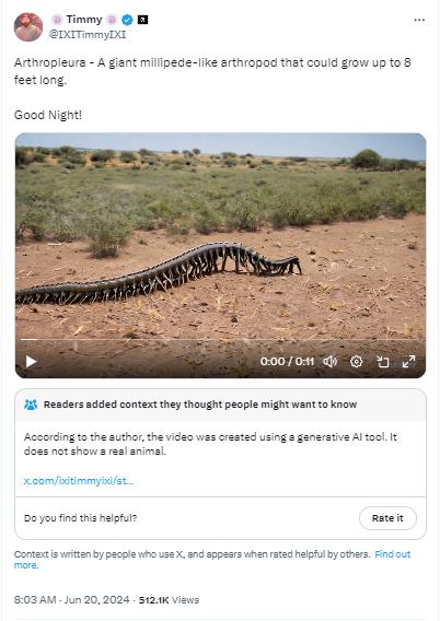ضجّة واسعة في وسائل التواصل الاجتماعي بسبب فيديو يُزعَم انه يظهر "أم اربع واربعين عملاقة رُصِدت في أوستراليا"، أو "صنفاً من حيوانات العصور ما قبل التاريخ في لندن". الا أن هذه المشاهد غير حقيقية، لكونها منشأة بواسطة برنامج ذكاء اصطناعي، بتأكيد من منشئها حساب IXITimmyIXI@، الذي نشرها بهذا الوصف في 20 حزيران 2024. FactCheck#